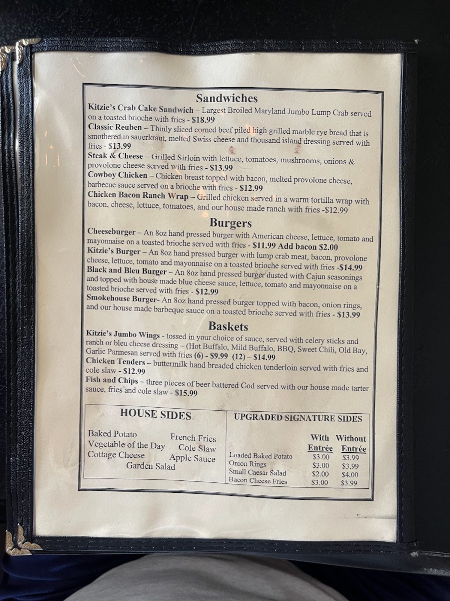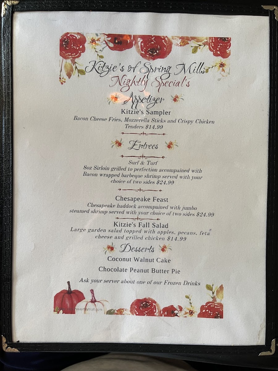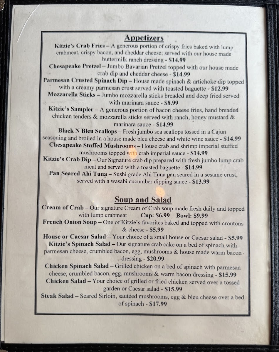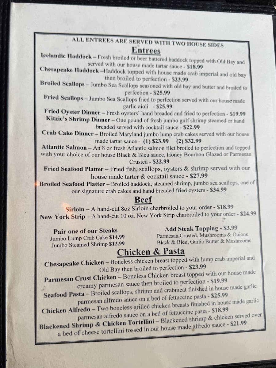 Welcome to Kitzie's of Spring Mills, where culinary excellence meets cozy ambiance in Martinsburg, WV. Nestled at 5623 Williamsport Pike, this gem offers a menu that leaves patrons raving about their experiences. The crowd-favorite crab cakes are made fresh daily and celebrated for their lump crab meat and minimal breading, ensuring a delightful seafood experience.